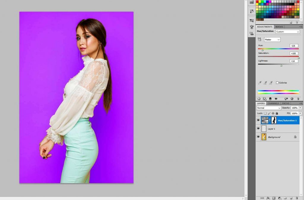 Then create a new adjustment layer of hue and saturation in the previous way. Simply change the value of hue and saturation and there will be change in the background.